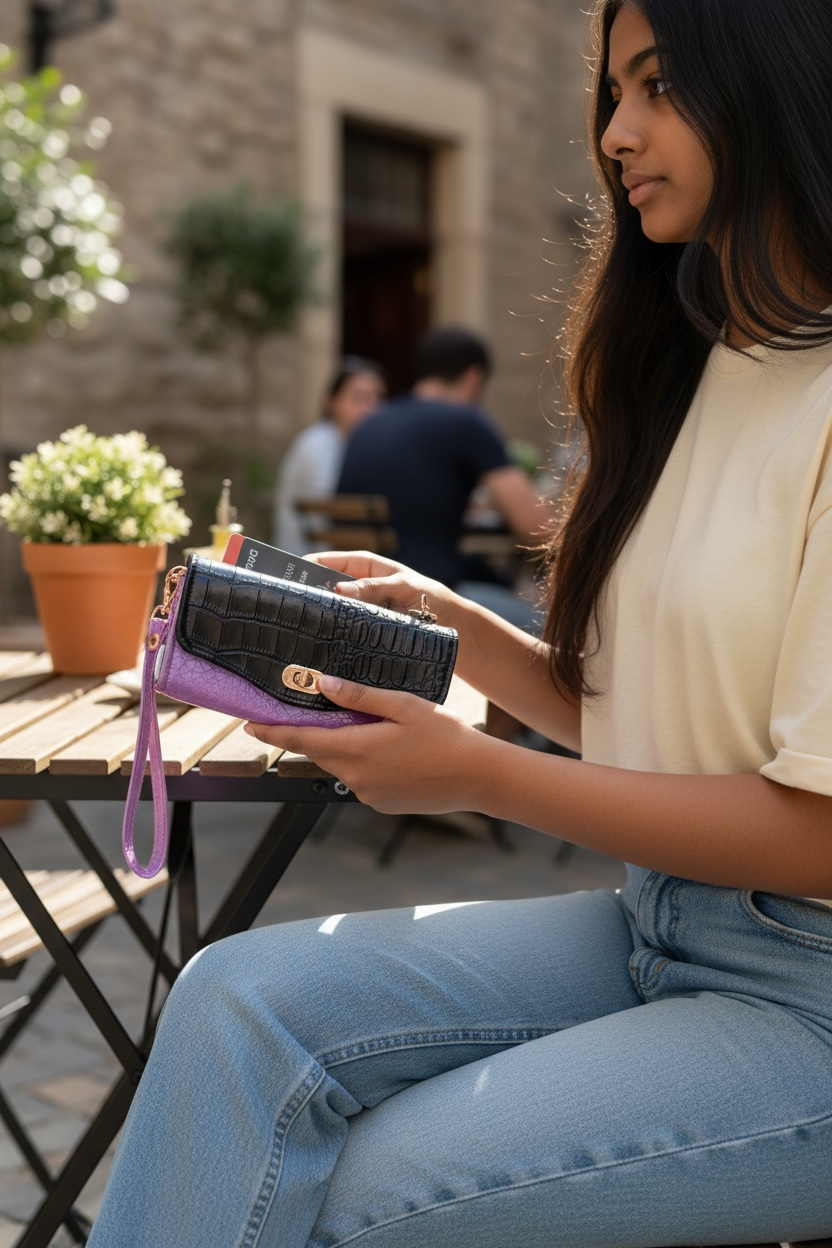 The exterior pairs luxurious black crocodile vinyl with bubblegum pink translucent vinyl, finished with rose-gold hardware for a chic, modern edge. The detachable wristlet strap gives you the freedom to carry it as a wallet, clutch, or wristlet.