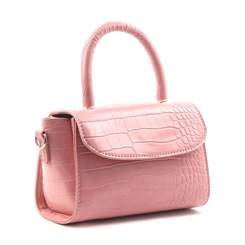 The Croc Embossed Faux Leather Clutch (Pink) has a magnetic-snap flap closure and includes a shoulder strap. This versatile accessory is offered in a lovely shade of pink.